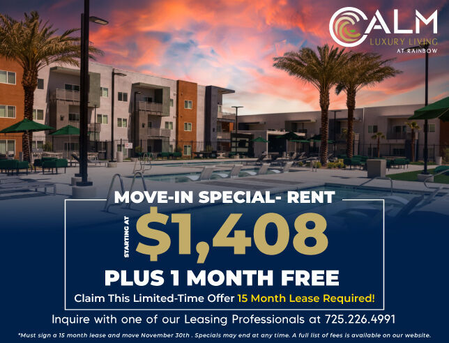 Welcome to Calm at Rainbow, a residential community featuring studio, one, two and three bedroom apartments in Las Vegas, NV. Spacious layouts and amenities welcome you home, along with exceptional service and an ideal location within walking distance to shopping, dining and entertainment options. Are you looking for an apartment for rent in Las Vegas, NV? Contact our friendly, professional office staff to schedule a tour today.